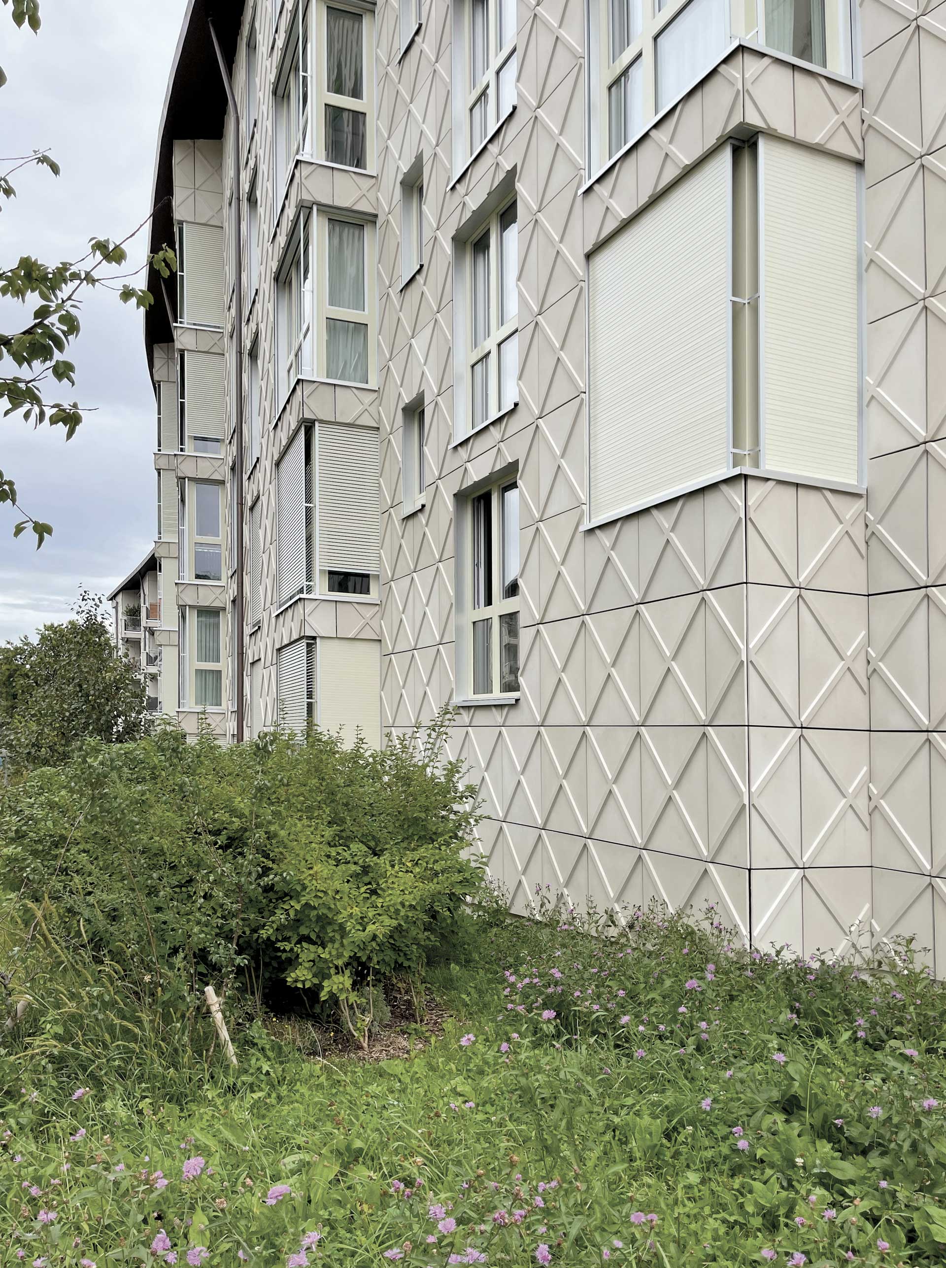 Il en résulte six rangées de bâtiments isolés de 90 mètres de long, incurvés et visuellement compacts malgré leur taille. Les appartements sont orientés vers les espaces verts à l’est et à l’ouest. Des déports dans les façades permettent également une vue vers le nord et le sud. Les fenêtres orientées dans toutes les directions et les balcons spacieux laissent entrer beaucoup de lumière dans les appartements. La construction aérée et ouverte assure un ensoleillement optimal.